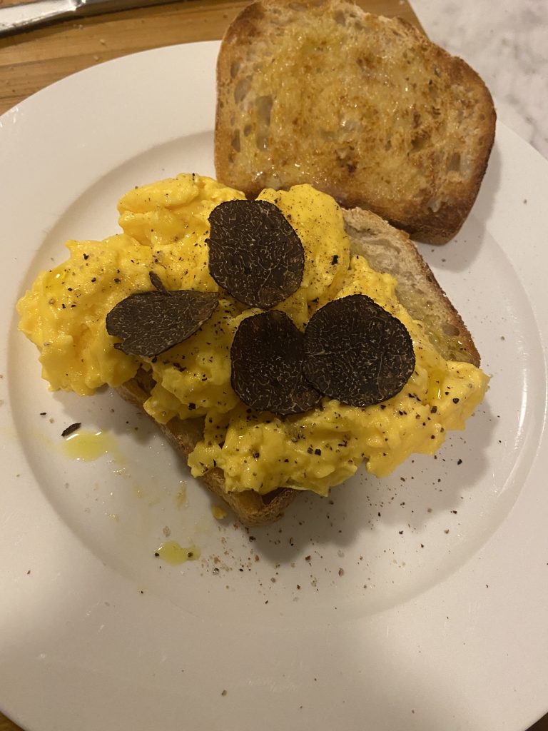 Sunday night family Dinner was Mushroom risotto with truffles of course. It was a bit like that as well all week. We had truffles twice, both Monday and Thursday nights… On scrambled eggs of course! Both times on delectable homemade sourdough.