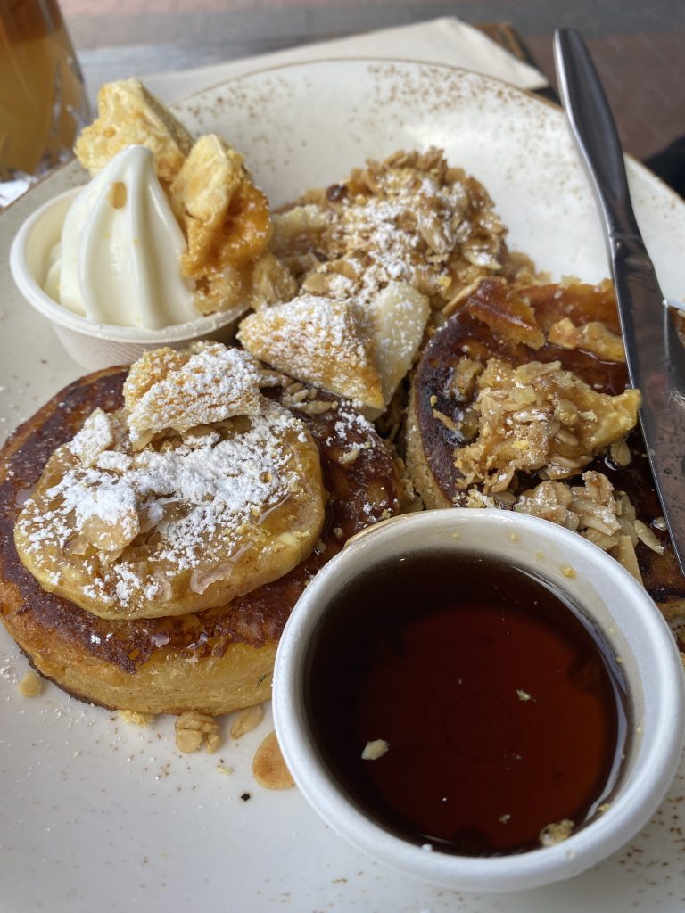 Patissez is known for (at least in my mind) their slow-cooked pork. My general go-to breakfast eat-out is Eggs Benedict and here they have “Pulled Pork Benedict” so that was a no-brainer for me. Anna’s choice took a bit longer, but she finally decided on the Hot Cakes for drinks I had the artisan hot chocolate and Anna had juice.