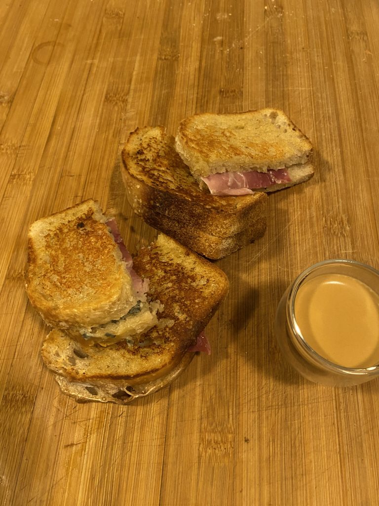 Anyway the day was done and it was home time, I knew Anna was on her way out tonight to the Bull and Bell Steakhouse restaurant and that made for the hardest decision of the day, what to eat for dinner… I started off with the idea of a steak from my favourite butchers out at Hanwood, followed by a thought of frozen fish cocktails and sweet potato fries (smothered in garlic aioli). The sight of Anna’s latest batch of sourdough sitting on the bench, and slices of prosciutto (seriously though am I the only one that keeps a pack on hand?) in the fridge piqued my interest in a prosciutto / blue cheese / soughdough toastie with a parmesan crust. A dearth of blue cheese was my only problem, grab the keys and off to Woolies for a quick stock-up, (along with an obligatory Nudie pulp-free OJ and tub of ice cream).
